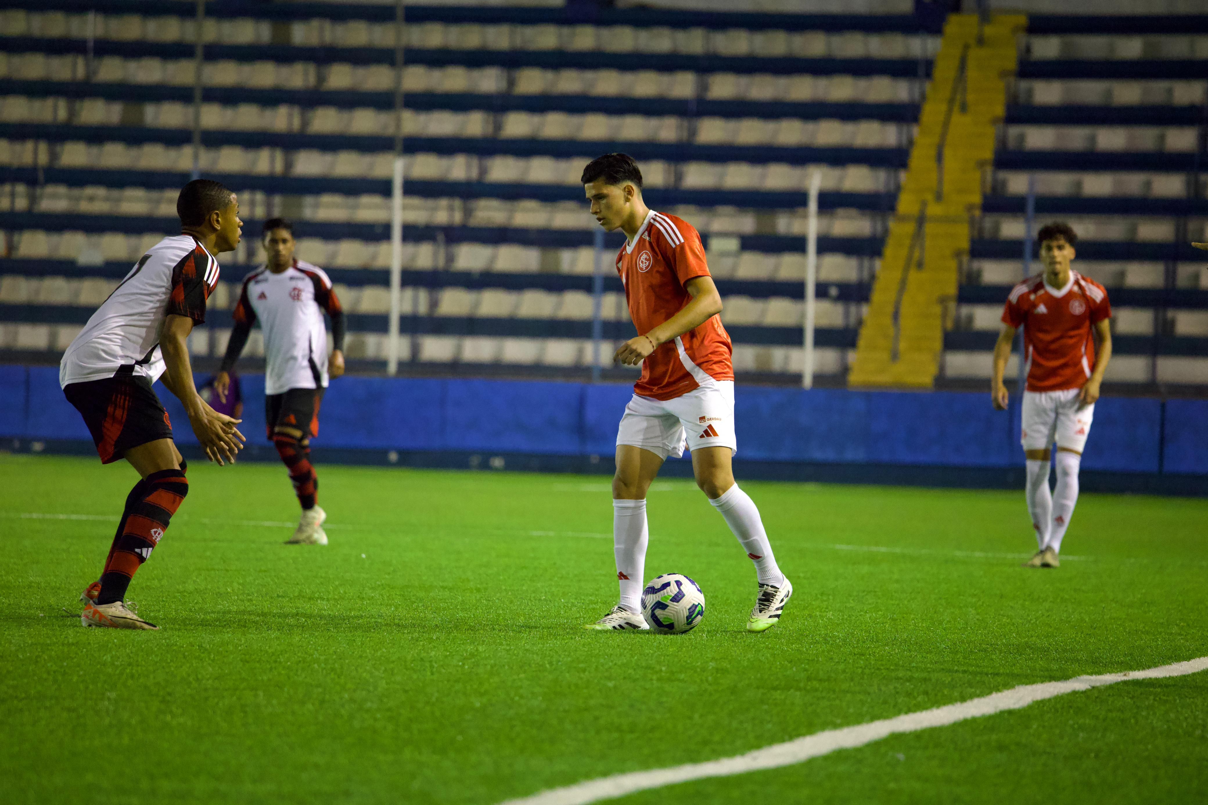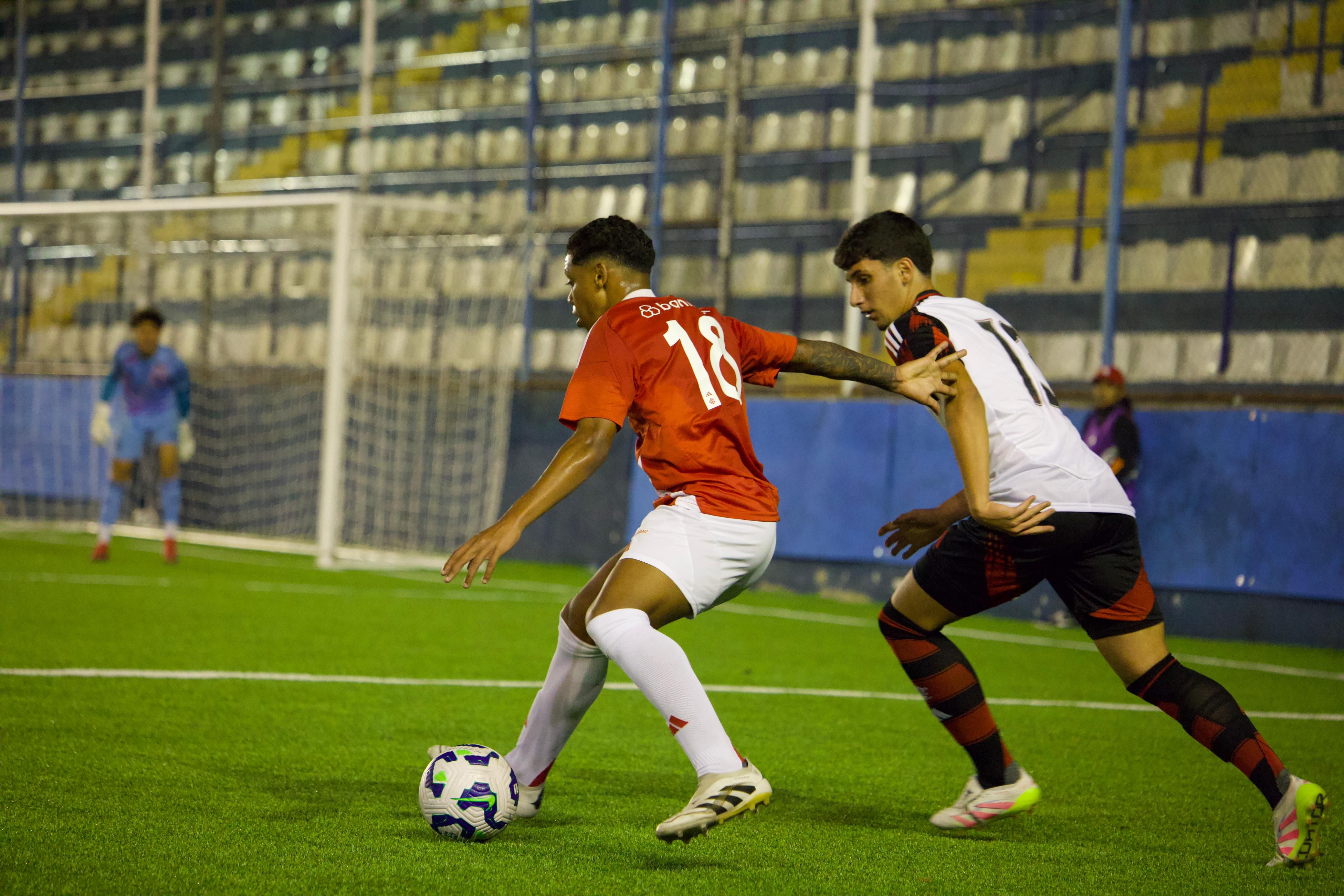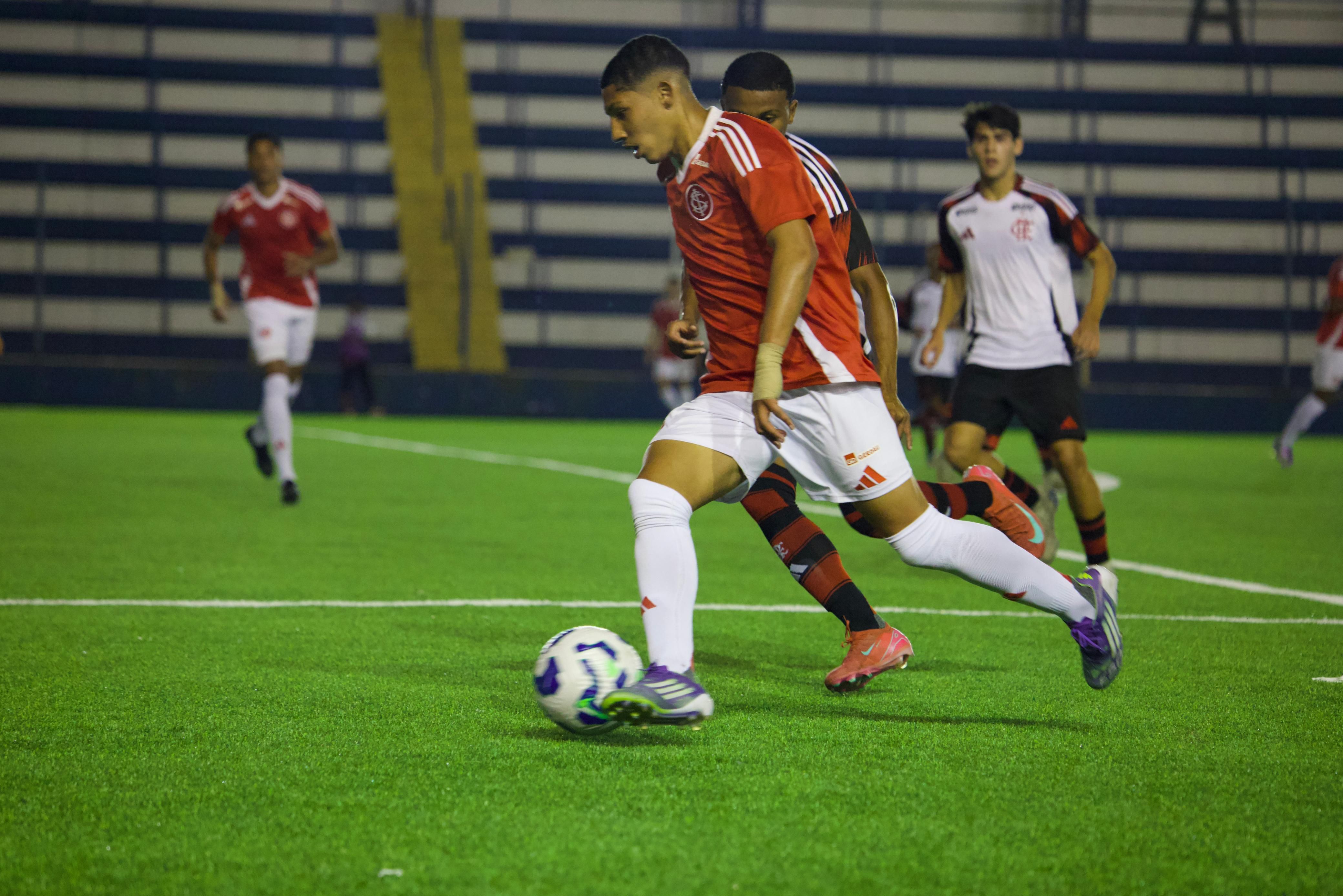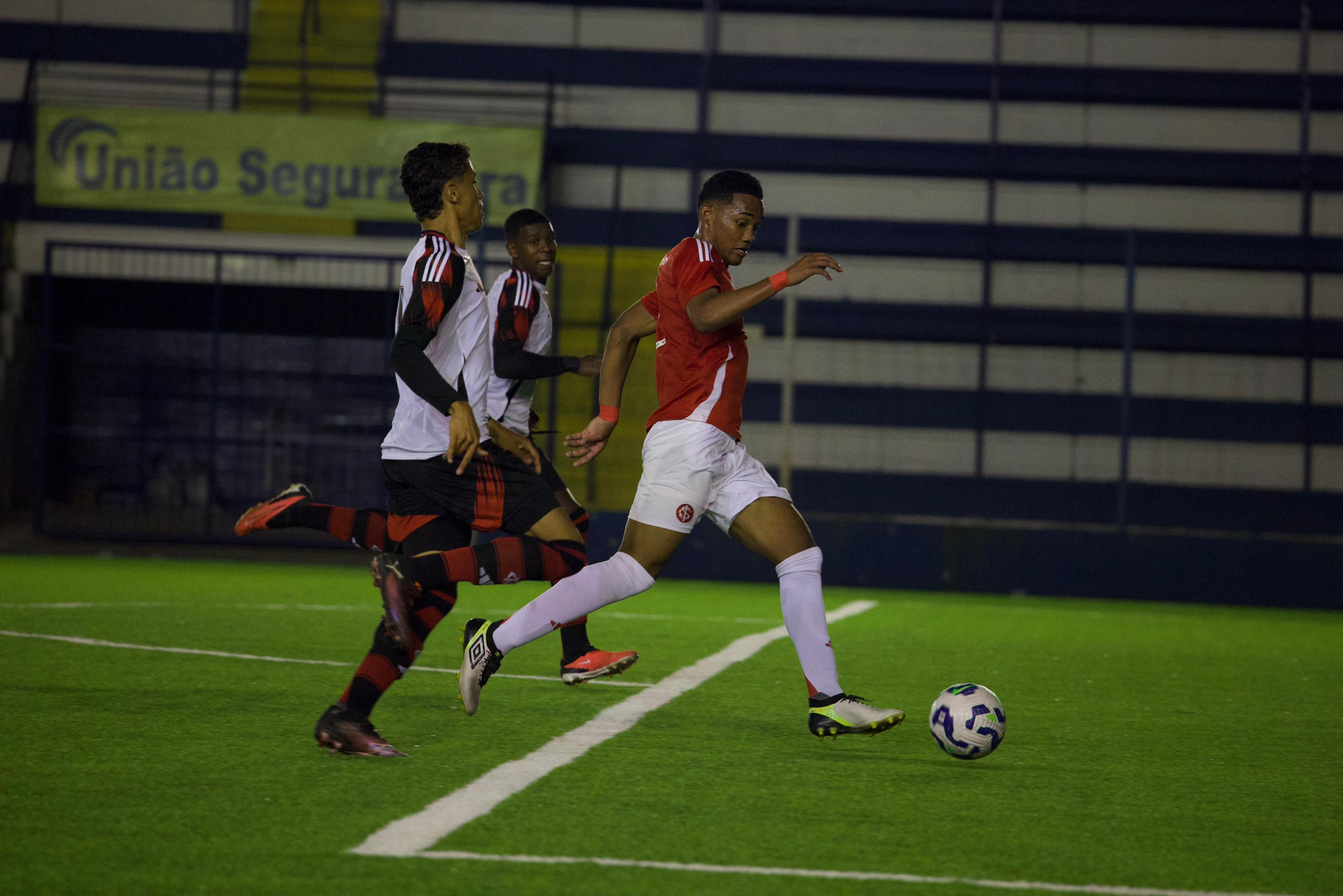 As primeiras oportunidades do Flamengo não representaram verdadeiro perigo para Lucas Gabriel. Aos sete, o goleiro colorado defendeu, com tranquilidade, arremate de Jhefinho Vinicius. Na sequência, quem arriscou de fora da área foi Rogerio Araujo. Sem direção, o chute saiu pela linha de fundo. Em velocidade, o Inter voltaria a assustar com João Kempes: após contragolpe puxado por Raykkonen, o camisa 10 definiu de canhota e Gabriel Werneck fez a defesa.